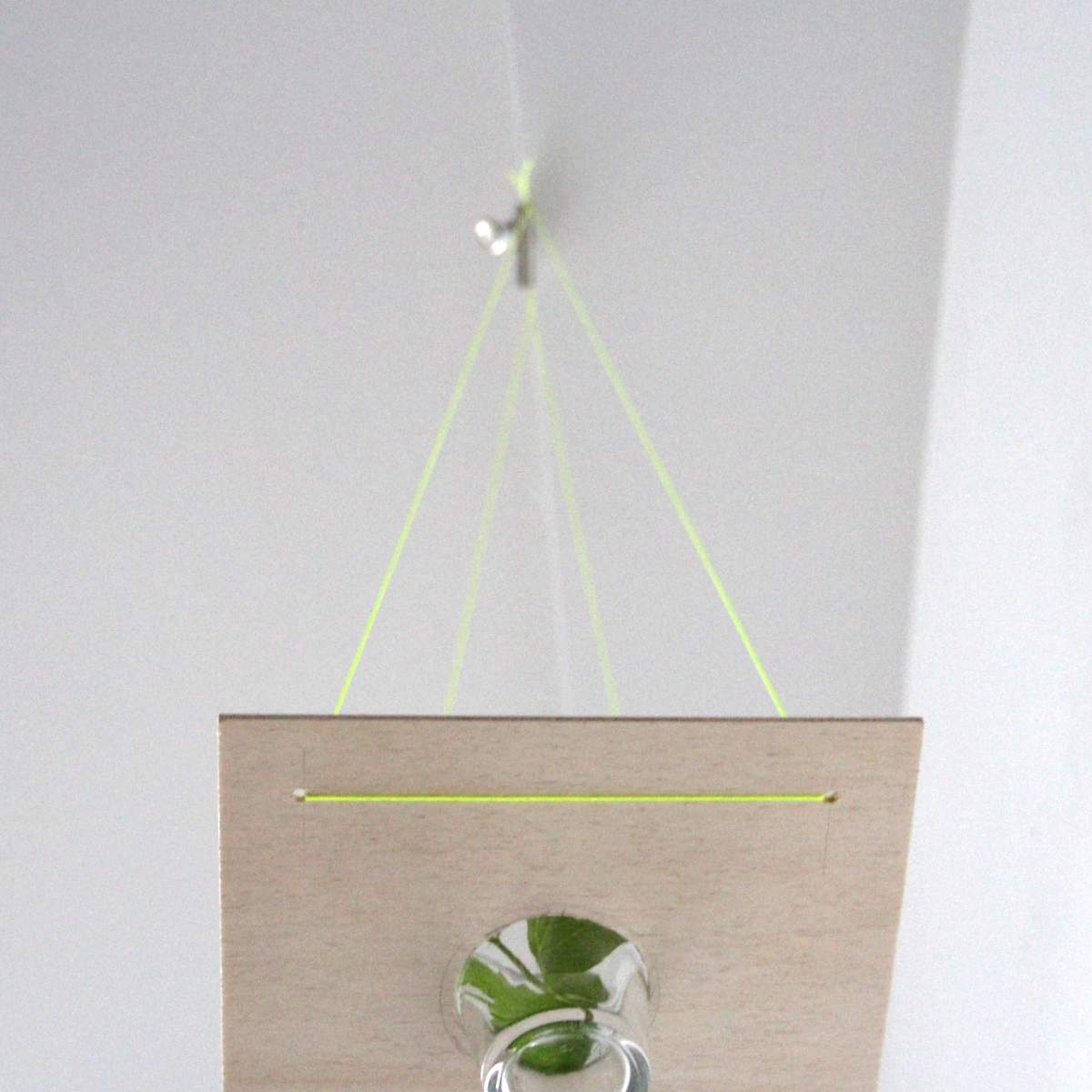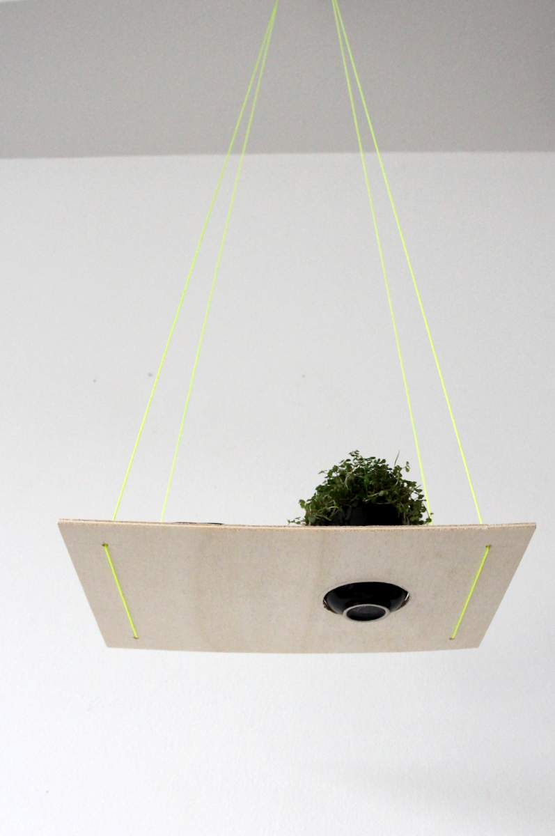 Bei uns ist die zweite Variante hängen geblieben. Das hätte ich im Anfang gar nicht gedacht, weil ich mir das Neon eigentlich ein wenig über gesehen habe. Aber es wirkt insgesamt einfach leichter und frischer als die Aufhängung mit Lederbändern. Ausserdem finde ich es noch einmal besonders hübsch, wenn das Gefäß die Sperrholzplatte nach unten durchbricht.