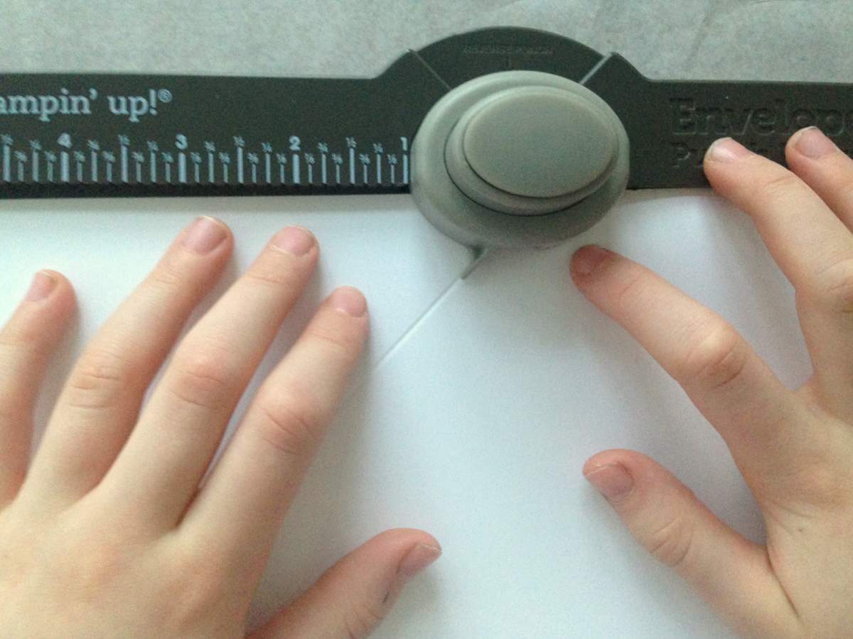 Dreh das Papier einmal um 90° nach links und leg das Papier wieder am oberen Rand an. Jetzt musst du dich nicht mehr an den Zentimeterangaben orientieren. Leg das Papier genau so an, dass die kleine „Nase“ an der Stanze auf die schon markierte Falzlinie zeigt.